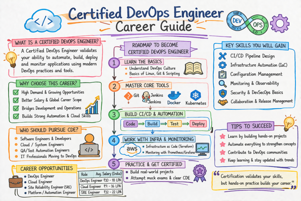 A strong DevOps engineer helps teams reduce manual work, improve deployment quality, shorten release cycles, and make production systems easier to manage. The official CDE page frames the certification around implementing core DevOps practices rather than learning isolated tools, which is why it fits real engineering roles better than a purely concept-driven certificate.